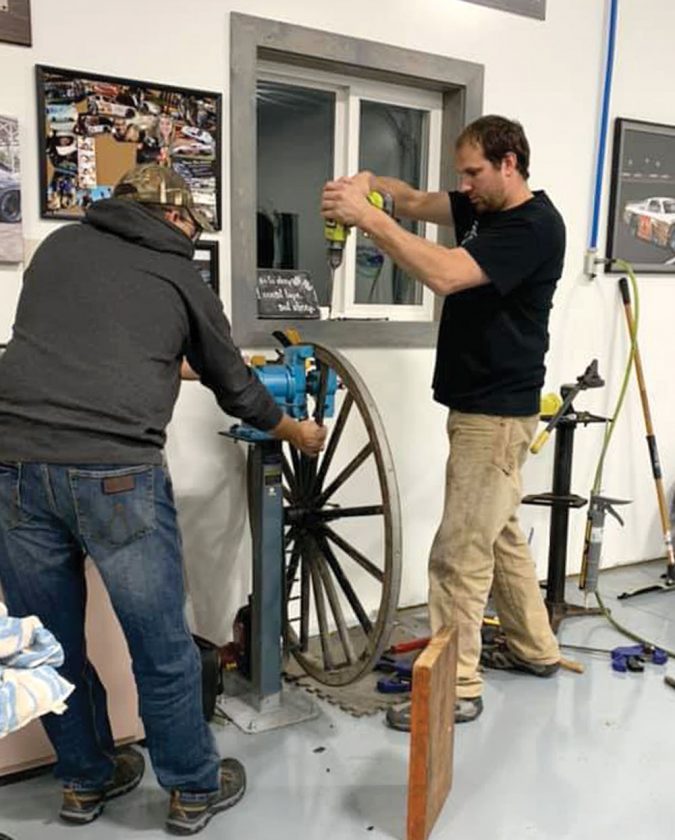 Dan Lindsley, along with friends Bret Kraemer and Rodney Anderson, were able to repair more than half the spokes on the wooden wagon wheel.