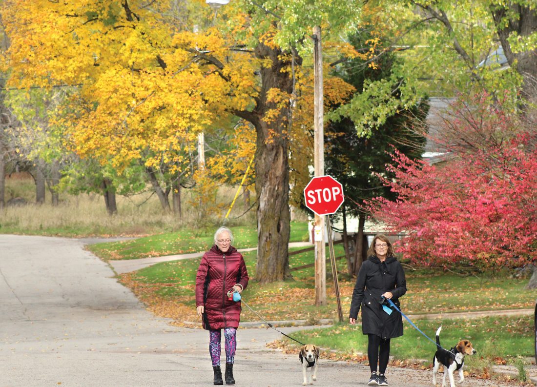 DEBBIE FANNERY, LEFT, and Susan Strang of Iron Mountain walk beagle buddies Itchie and Charlie down Van Buren Street in Iron Mountain on Wednesday afternoon. (Theresa Proudfit/Daily News photo)