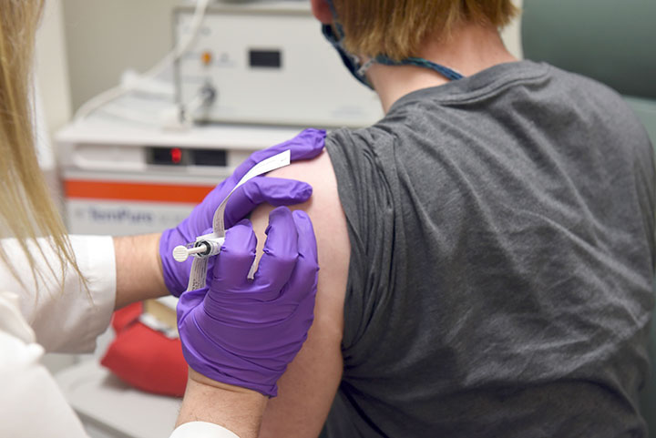 THIS MAY 4 PHOTO provided by the University of Maryland School of Medicine shows the first patient enrolled in Pfizer's COVID-19 coronavirus vaccine clinical trial. Pfizer said Monday an early peek at its vaccine data suggests the shots may be 90% effective at preventing COVID-19. (Courtesy of University of Maryland School of Medicine via AP, File)