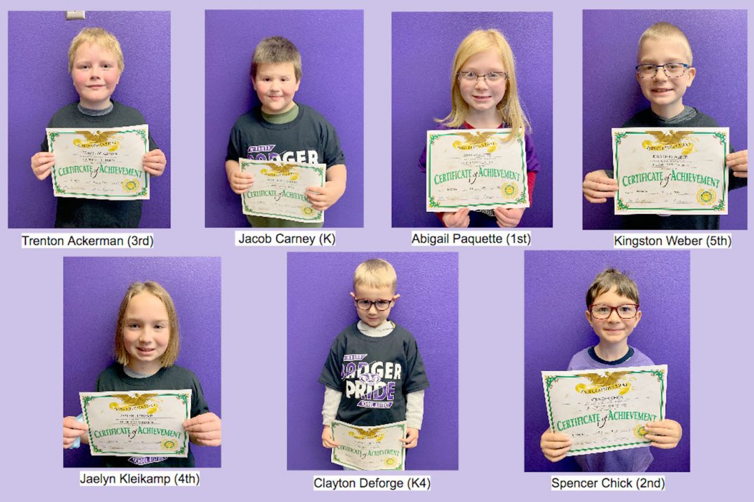 Students of the Month for October at Niagara Elementary School in Niagara, Wis. — from left, at top are third-grader Trenton Ackerman, kindergartner Jacob Carney, first-grader Abigail Paquette, and fifth-grader Kingston Weber; in the lower row are fourth-grader Jaelyn Kleikamp, 4-year-old kindergartner Clayton Deforge, and second-grader Spencer Chick.