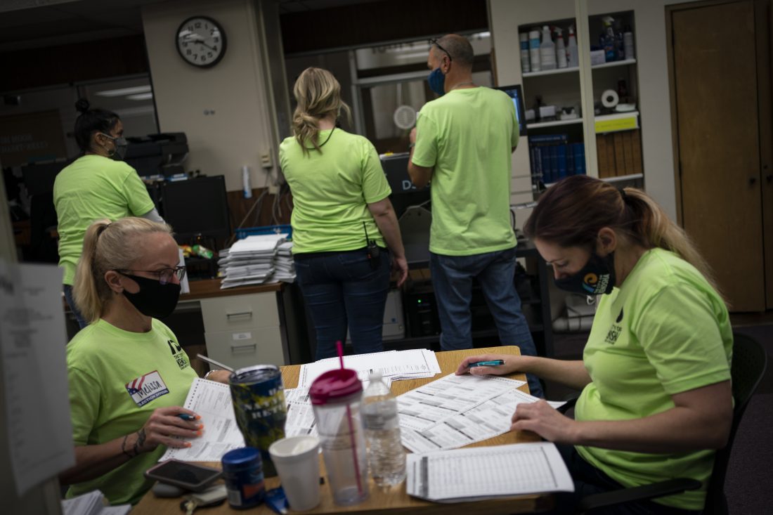 Poll workers sort out early and absentee ballots at the Kenosha Municipal building on Election Day on Tuesday, Nov. 3, 2020, in Kenosha, Wis. (AP Photo/Wong Maye-E)