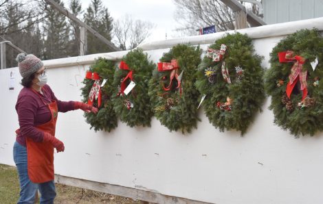 Rose sits at a bench with a wheel set in the surface like a table saw, weaving cut evergreen branches to build each wreath by hand. She’ll add ribbons and perhaps some other decorations, none quite the same. All tend to find a buyer, no matter what style.