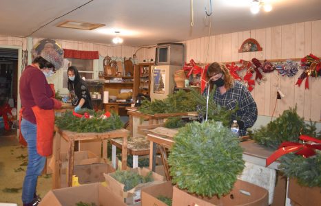 Some of the crew that helps put together wreaths and other seasonal decorations at Trees by Wallace in the Town of Amberg, Wis. At left is Holly Wallace, in back is Miriam Johnson and at right is Tina Skenandore. (Betsy Bloom/Daily News photo)