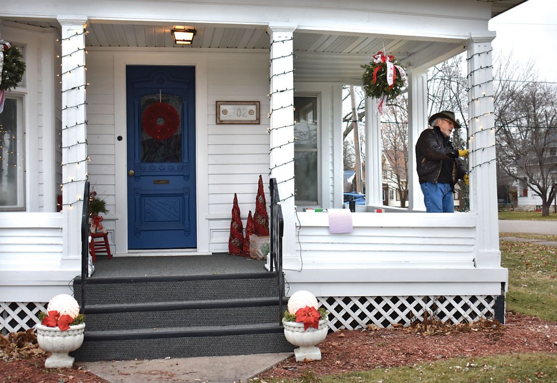 JOE RAKE SPENT part of Sunday stringing lights around the porch posts at 1102 Carpenter Ave. in Iron Mountain, which is the office for his wife, psychologist Dr. Lisa Pangrazzi. (Betsy Bloom/Daily News photo)