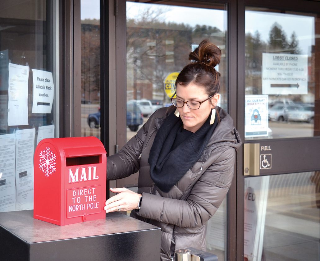 DOWNTOWN DEVELOPMENT AUTHORITY Program Director Amber Pipp sets up the “Letters to Santa” mailbox outside of Iron Mountain City Hall as part of the annual Downtown Christmas Walk. Starting Monday, area children will be able to drop off their letters any time before Christmas. Those will then be mailed straight to the North Pole. (Terri Castelaz/Daily News photo)