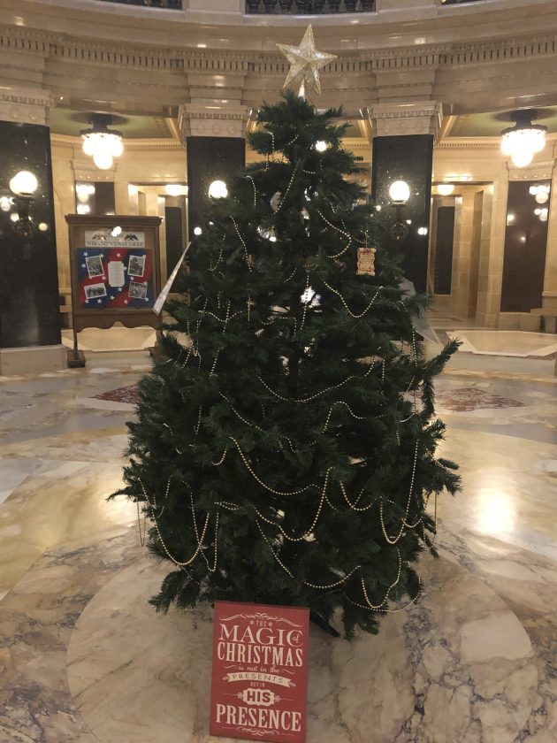 The lawmakers put up a tree in the rotunda anyway on Dec. 1 before they received a decision on the permit from DOA, Sortwell said. The seven-foot artificial decoration was still there on Monday morning, complete with signs that read, “The magic of Christmas is not in the presents but in his presence” and “This tree belongs to Representative Tittl and Representative Sortwell. Do not move without prior written approval from these Representatives.”
