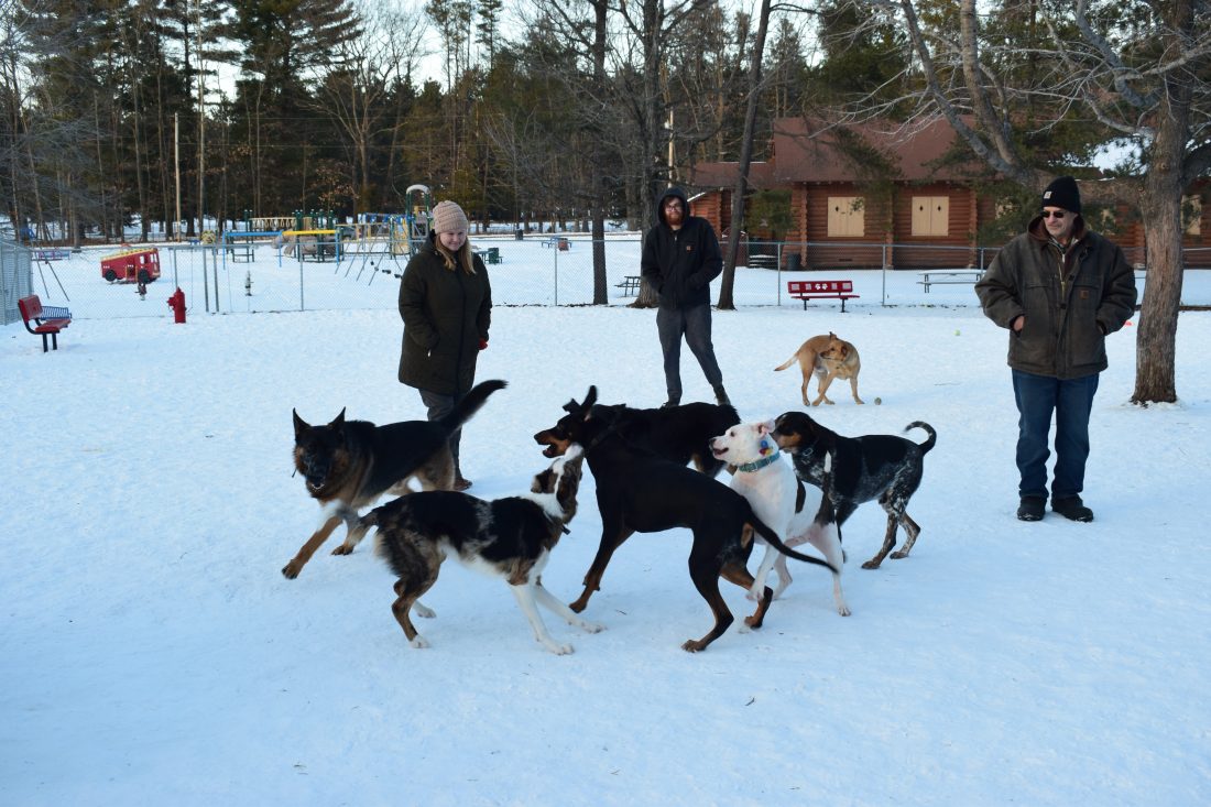 Martie Nord and Colten Stevens, from Iron Mountain, and Mike Nekhay, also of Iron Mountain, look on as dogs play in Iron Mountain City Park on Friday. Second from left is Finnick, an 8-month-old border collie belonging to Nord and Stevens, and at right is Axel, Nekhay’s bluetick coonhound.