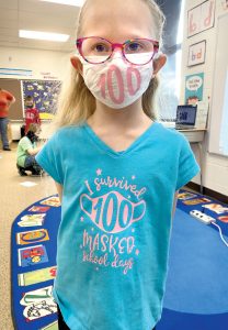 - North Dickinson County School District first-grade students celebrated the 100th day of school on Wednesday by bringing in collections of 100 items, doing a Tootsie Pop challenge, coin flip and some 100-second exercises. Teacher Angie Mattson does these activities annually in class and never knows what interesting things will come in, Superintendent/Principal Angel Inglese said. Gabriella Anderson sports a 100-day mask and shirt. (Submitted photo)
