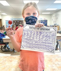 - North Dickinson County School District first-grade students celebrated the 100th day of school on Wednesday by bringing in collections of 100 items, doing a Tootsie Pop challenge, coin flip and some 100-second exercises. Teacher Angie Mattson does these activities annually in class and never knows what interesting things will come in, Superintendent/Principal Angel Inglese said. Lilly Steppig shared her 100 Tootsie Pop experiment. (Submitted photo)
