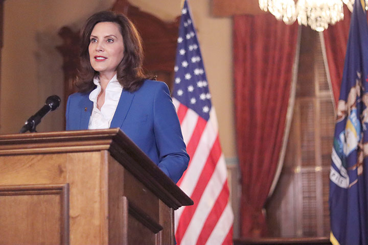 MICHIGAN GOV. GRETCHEN WHITMER delivers her virtual State of the State address Wednesday in Lansing, Mich. (Michigan Office of the Governor via AP)