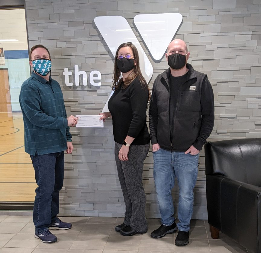 Alissa Hedlund, center, and Paul Picucci, right, of IncredibleBank present a 2021 Annual Campaign donation to Northern Lights YMCA Dickinson Center Director Jonathan Ringel.