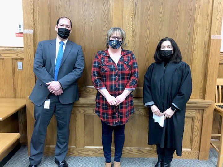 Carol Bronzyk was selected as the new Dickinson County clerk/register of deeds by the two circuit court judges, Christopher Ninomiya at left and Mary Barglind at right. (Submitted photo)