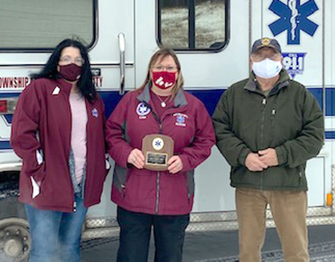 The Richard Steber EMS Meritorious Service Award was presented to Lisa Casey, EMT from Nordic Ambulance. Casey has been with Nordic Ambulance since 2017. She is one of the top responders for 911 calls and also helps by keeping the ambulance stocked and up to date. She raised money to buy a Lucas CPR device and organized birthday parades for community members. She is always willing to step up in any way to help her squad and patients. From left are Rebecca Pollock, Nordic EMT and squad leader; Lisa Casey, Nordic EMT award recipient; and Bob Mattson, Tri-Township board member and president/chairperson.