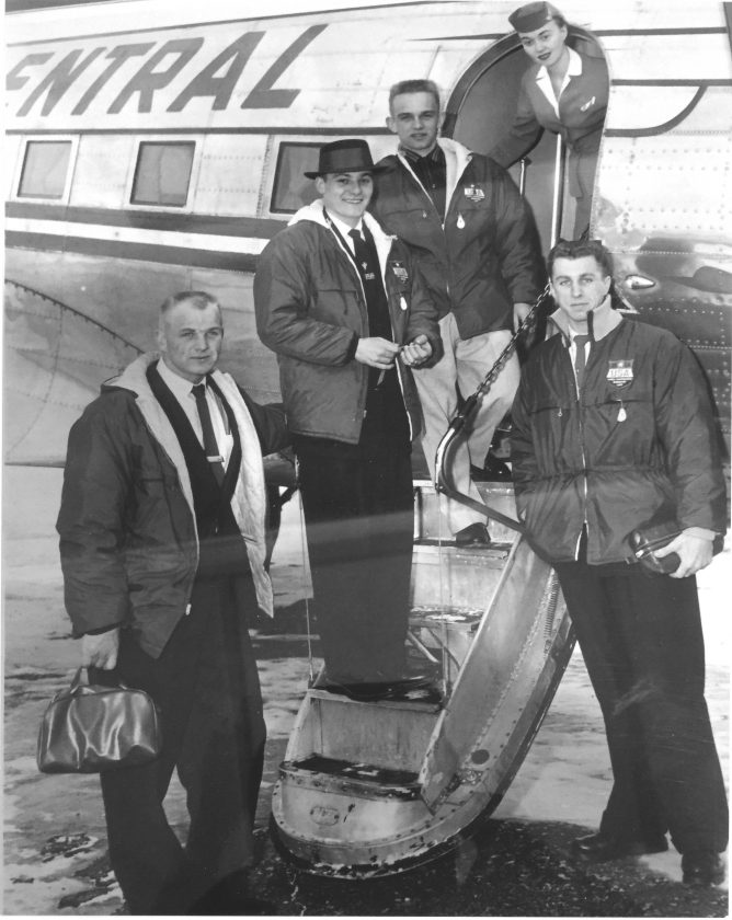 Today’s “Throwback Thursday” photograph features Kiwanis Ski Club ski jumpers in 1959, boarding a flight at Ford Airport in Kingsford to travel to the FIS World Championships in Lahti, Finland. From left are Rudy Maki of Ishpeming and Kiwanis jumpers Dick “Cussy” Rahoi, Jim House and Willie Erickson.