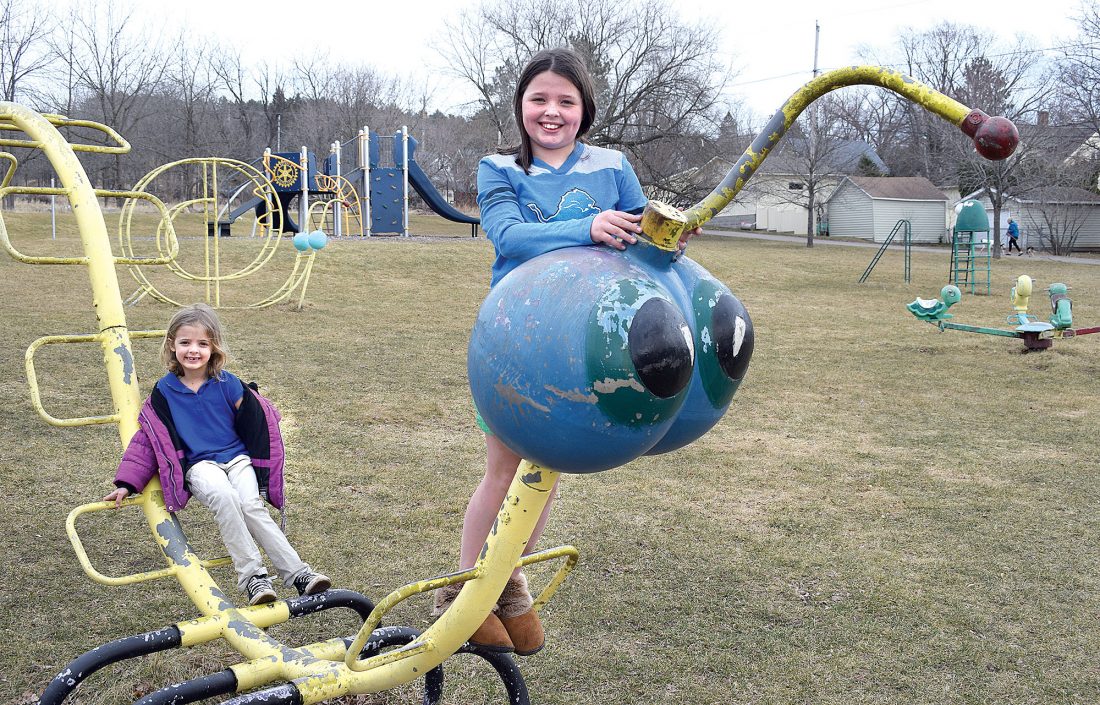 Elise, 11, and 7-year-old Rebecca Cameron of Iron Mountain have fun after school at the east side playground. Elise is a fifth-grade student and Rebecca is in first grade at Bishop Baraga Catholic School in Iron Mountain. The recent warmer weather will give way to highs generally in the 40s. (Terri Castelaz/Daily News photo)