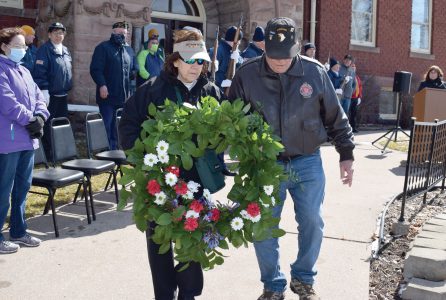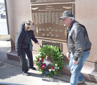 After the morning program, the group shifted to the Dickinson County Courthouse grounds for a wreath-laying ceremony at the memorial to “those who were killed or died in service of their country.”
