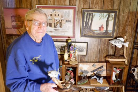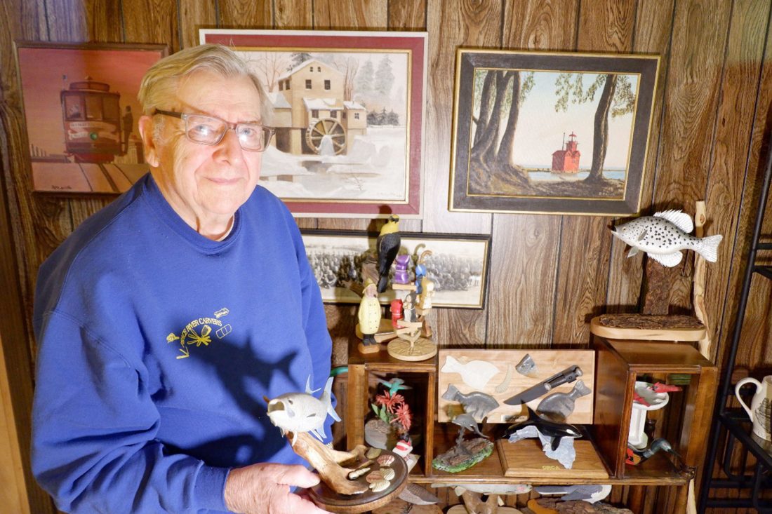Russel Westfahl of Crystal Falls holds his favorite fish carving, a tarpon that he places among the rest of his plethora of wooden creatures. Westfahl won first place in a recent national arts competition for veterans. The U.S. Marine has carved more than 675 pieces over his career and has won more than 80 awards. ( John Jamison/Oscar G. Johnson VA Medical Center)