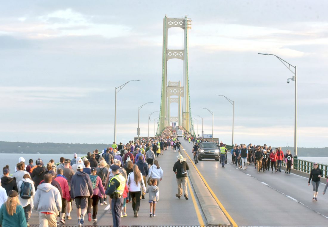 PEDESTRIANS WALK THE Mackinac Bridge in 2019 during the 62nd annual Labor Day Bridge Walk in Mackinaw City, Mich. The Mackinac Bridge Authority today suspended this year's event due to the ongoing COVID-19 pandemic. (AP Photo/John L. Russell, File)