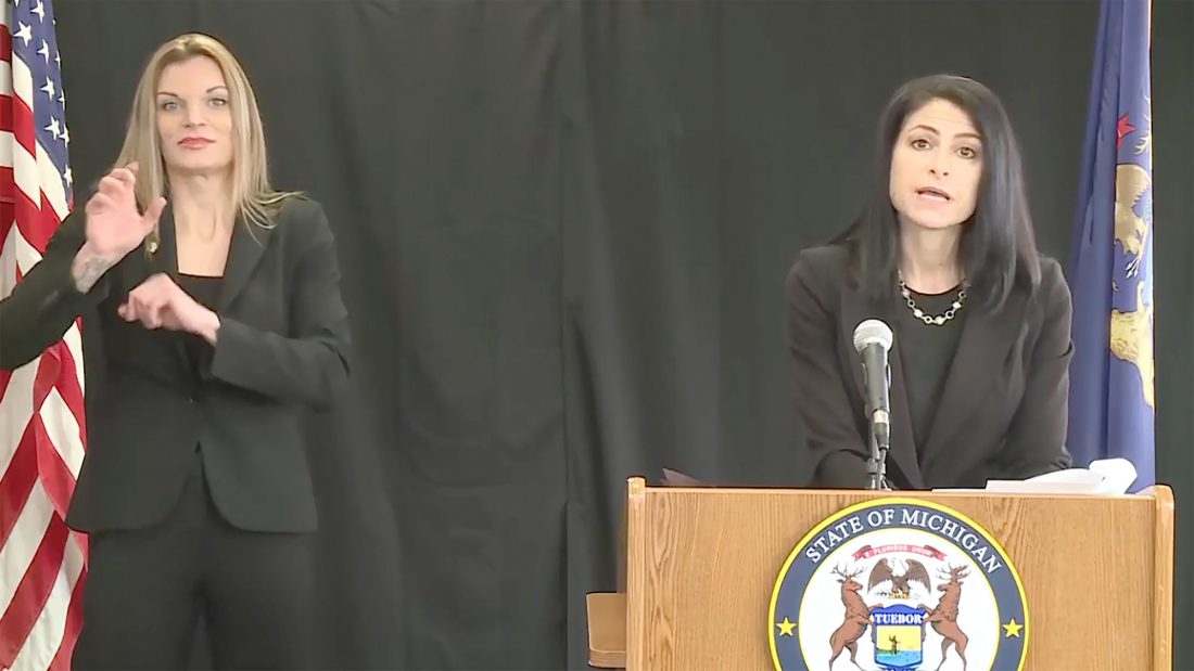 MICHIGAN ATTORNEY GENERAL Dana Nessel, right, speaks in Lansing Jan. 14, Nessel has opened an investigation after a Republican-led state legislative panel said people were making baseless allegations about 2020 presidential election results in a northern Michigan county to raise money or publicity for their own ends. (Michigan Office of the Attorney General via AP)