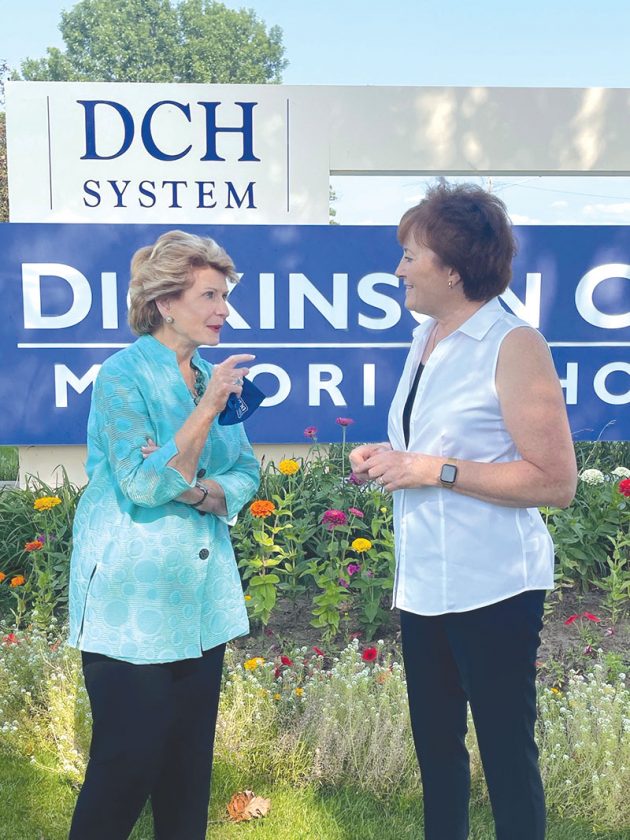 U.S. Sen. Debbie Stabenow, D-Mich., left, chats Thursday with Margaret Minerick, chairwoman of the Dickinson County Healthcare System Board. Stabenow toured the the hospital campus and had a listening session with DCH leaders, who thanked the senator for her efforts in securing a $16.9 million U.S. Department of Agriculture Rural Development loan authorized this spring. Stabenow was able to view new imaging, cardiac and cancer treatment equipment, including a Varian TrueBeam linear accelerator used in precision radiotherapy. Stabenow also toured the Oscar G. Johnson VA Medical Center in Iron Mountain, congratulating employees on the VA being voted the best facility in the nation for patient satisfaction. (Dickinson County Healthcare photo)