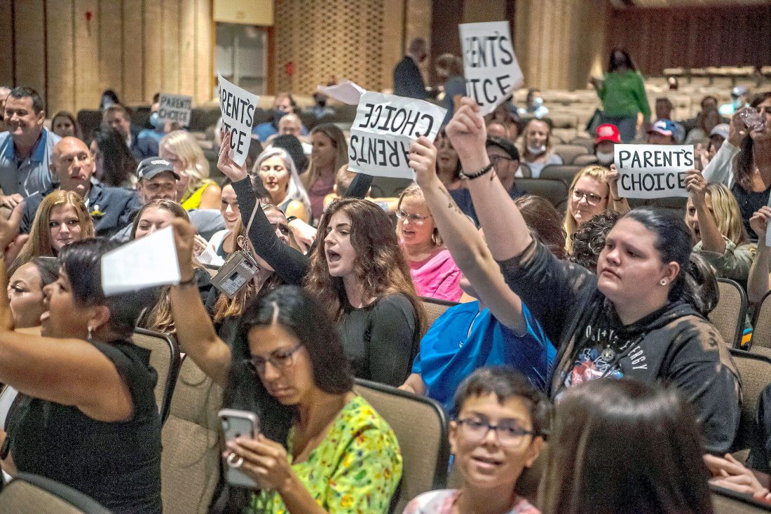 PEOPLE CHANT DURING a meeting of the North Allegheny School District school board Aug. 25 in McCandless, Pa., regarding the district’s mask policy. (Alexandra Wimley/Pittsburgh Post-Gazette via AP, File)