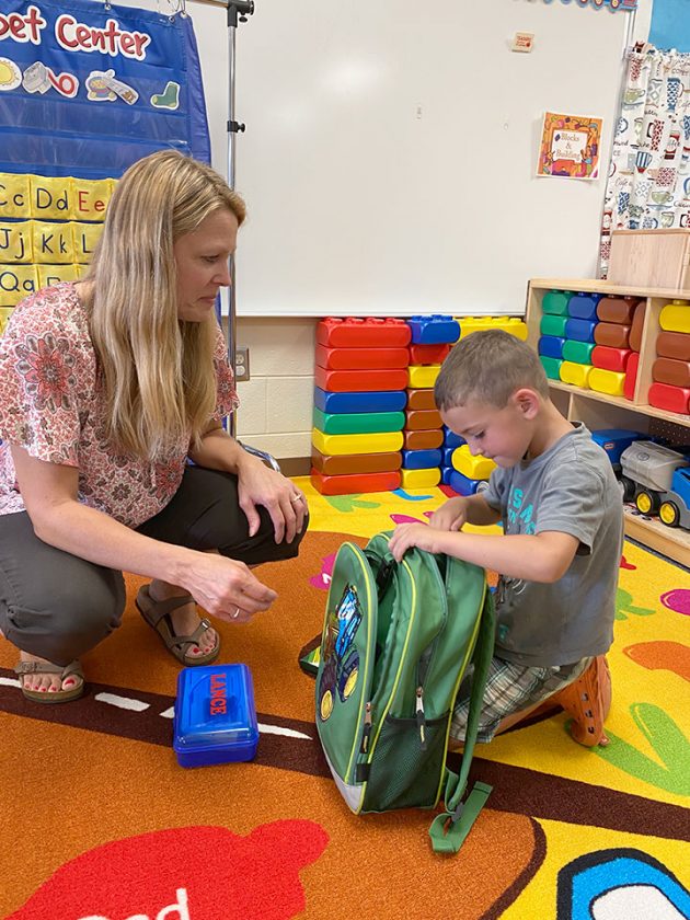 Lance Cayemberg, 4, shows his prekindergarten teacher, Deanna Michaud, the new school supplies in his backpack during an open house Monday at Norway Elementary School. He is the son of Ross and Kalee Cayemberg of Vulcan. The Norway-Vulcan School District will begin classes Wednesday. (Terri Castelaz/Daily News photo)
