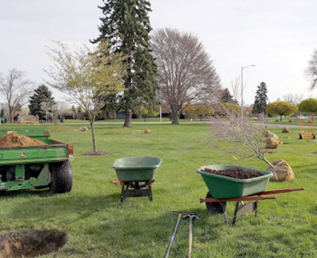 Michigan DNR photo Wheelbarrows, shovels and mulch are at the ready for planting of burlap balled trees.
