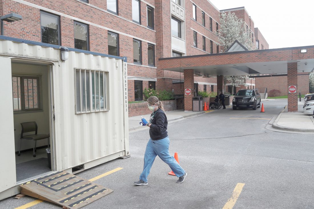 A PHYSICIAN ASSISTANT prepares a COVID-19 test in April as she walks into a trailer set up outside of the emergency entrance of Beaumont Hospital in Grosse Pointe, Mich. Michigan health and business officials are pleading with people to get vaccinated against COVID-19. (Junfu Han/Detroit Free Press via AP, File)