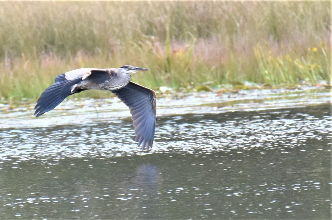 The ones that spend time on our local lakes and rivers probably are non-breeding, as great blue herons prefer nesting in groups called rookeries, constructing stick nests in hardwood trees alongside water. Chicks hatch after about 27 to 29 days and fledge in about seven to eight weeks, so by mid-summer usually are out of the nest. These young birds will disperse widely — a study of more than 3,000 juveniles showed an average of 471 miles in the first winter — and don’t usually start breeding until their third spring, according to the Cornell Lab of Ornithology.