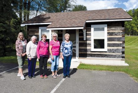 JAKE MENGHINI MUSEUM volunteers stand in front of Jake’s cabin, built in 1874, that will be dedicated on the museum grounds in Norway from 10 a.m. to noon Saturday. From left are Carol Sundstrom, Rosemary Vanpembrook, Judy Carlsen, Barb Menghini and Gayle Nicholson. (Marguerite Lanthier/Daily News photo)