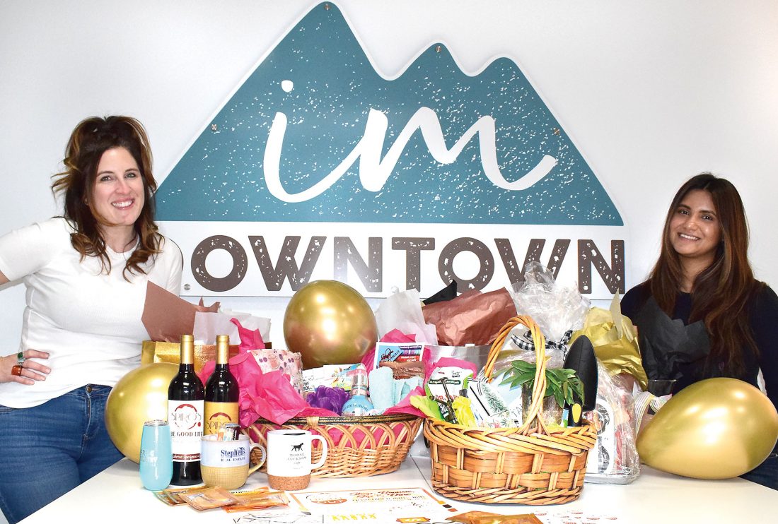 IRON MOUNTAIN DOWNTOWN Development Authority Program Director Mindy Wittock and DDA Events Coordinator Tania Mishra prepare raffle baskets for the Girls’ Night Out after-party Thursday at Sol Blu Lounge in Iron Mountain. The first 50 women to arrive after 7 p.m. will receive a swag bag sponsored by area businesses. This year’s Girls Night Out, coordinated by the DDA, will take place Monday through Thursday. (Terri Castelaz/Daily News photo)