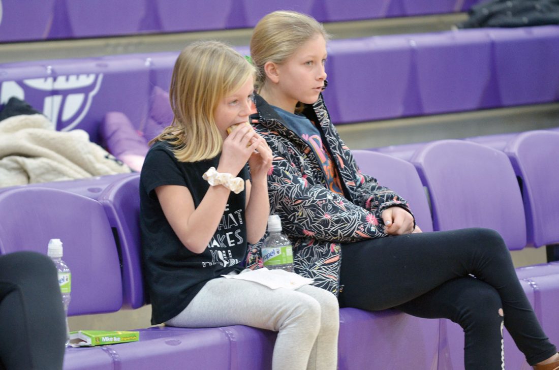 Jaylynn Marchetti, 8, of Niagara, Wis., enjoys a hotdog Tuesday afternoon during halftime of the Niagara High School girls varsity basketball game versus visiting Three Lakes with her sister, 11-year-old Jaycie Marchetti. The duo not only got to watch the players in action but also their grandfather, Ken Marchetti of Iron Mountain, who was one of three referees overseeing the contest. For complete coverage of the game, see Local Sports. (Dennis Mansfield/Daily News photo)