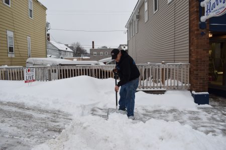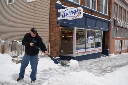 Employee Greg Jacobson shovels the sidewalk Tuesday afternoon in front of the Harry’s Plumbing & Heating Supply business on Ludington Avenue in downtown Iron Mountain. The area Tuesday received roughly 3 to 5 inches of new snow by evening. More scattered snow is possible today even as the region turns much colder, with overnight lows dipping below zero and dangerous wind chills.