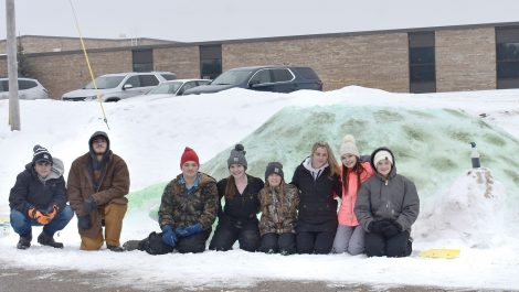 Members of the senior class at North Dickinson County High School in Felch Township worked on a snow sculpture of the sea turtle Crush from the Disney animated film “Finding Nemo” during Spirit Week for the school’s Winter Homecoming. Most of the senior class crew can be seen in this photo — from left are Maximus Mattson, Joseph Tickler, Gage Mattson, Isabella Reimer, Sophie Mattson, Cassandra Cary, Vanessa Lindholm and Ashton Hord. (Betsy Bloom/Daily News photo)