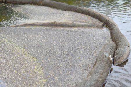 A BOOM COLLECTS PFAS foam in a ditch that runs into Green Bay in Marinette, Wis. Samples of foam collected from the ditch have shown PFOS levels as high as 63,000 parts per trillion. (Danielle Kaeding/Wisconsin Public Radio)