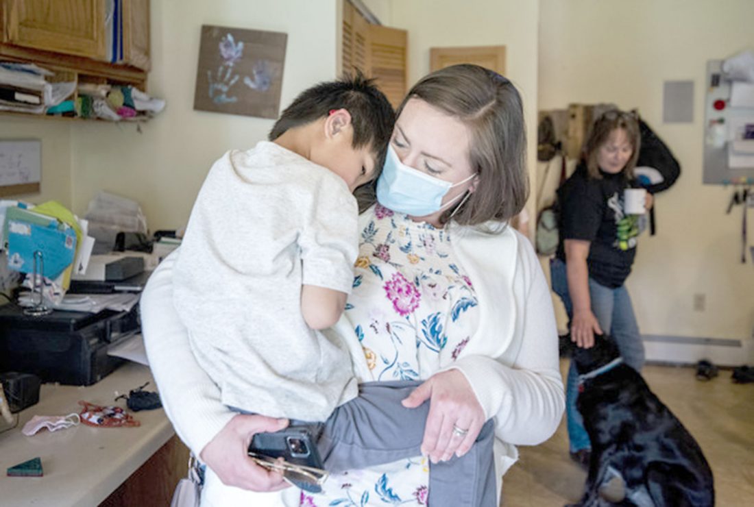 KAYLA FURTON HOLDS her son, Elias, in the kitchen May 20, 2021, in Peshtigo, Wis. The family has been living on bottled water due to PFAS contamination stemming from Tyco Fire Products' fire training facility in Marinette. (Angela Major/Wisconsin Public Radio)