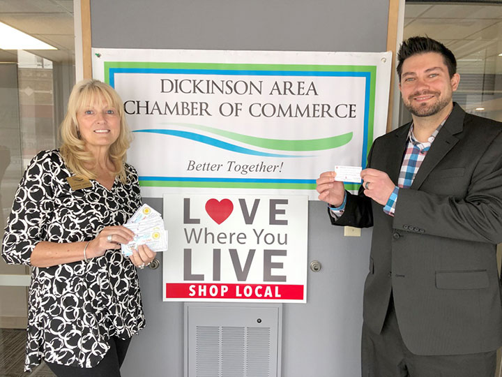 SUZANNE LARSON, Dickinson Area Chamber of Commerce executive director, and Matt Lutz, First National Bank & Trust chief financial officer, show the Spread Goodness Day-themed Chamber Cash and complimentary cards that will be used at several area businesses Friday to pay for random customers’ purchases to mark Spread Goodness Day.
