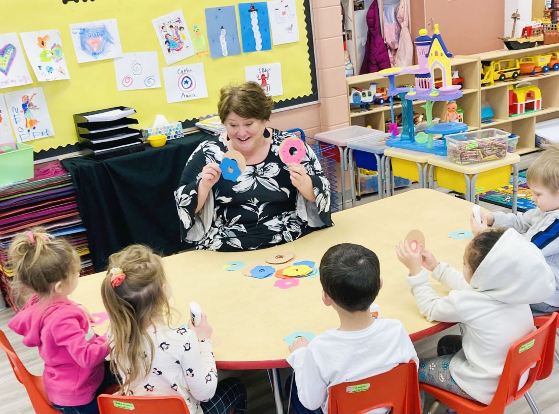 IRON MOUNTAIN-KINGSFORD Community School Preschool teacher Theresa Proudfit works with her students. From left are Thea Fehrle, Vera Fish, Ryan Phipps and Camila Hoke.