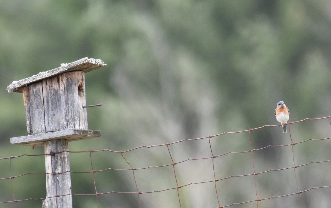 A MALE EASTERN bluebird keeps watch while a female, unseen, checks out a nesting box along Six Mile Lake Road in northern Dickinson County. The warmer weather this weekend saw a number of migrating songbirds return to the area, including reports of Baltimore orioles, rose-breasted grosbeaks and some of the first warblers. (Betsy Bloom/Daily News photo)