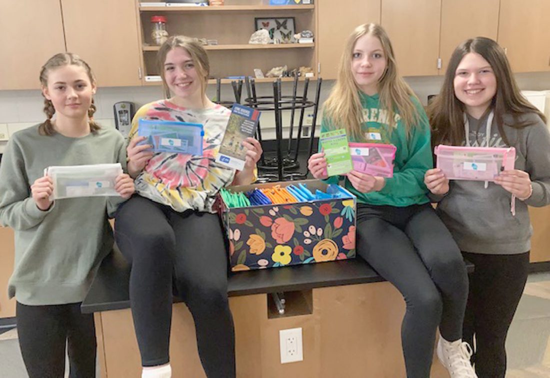 FLORENCE COUNTY SCHOOL eighth-grade students display tick kits available at the Florence County Health Department. From left are Samantha DeMuri, Madison Aubuchon, Anjuli White, and Jillian Robinson.
