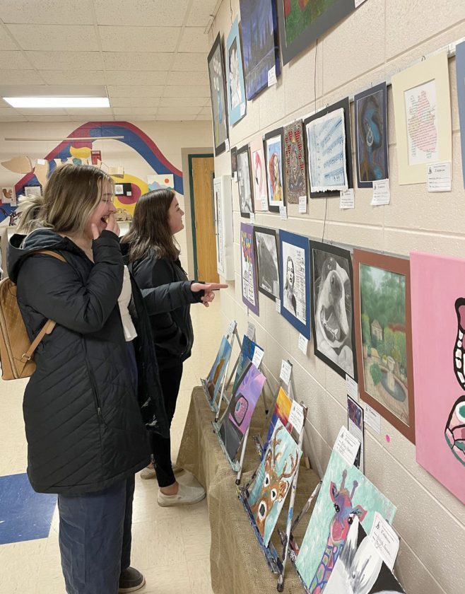 The Association of Student Artists recently had its art reception and awards program. Students from Norway, Iron Mountain and Kingsford schools, as well as Florence County, Niagara and Beecher-Dunbar-Pembine schools in Wisconsin, had work on display at Kingsford High School. Above, Airen Hale, left, and Paeyton Bengston react to work at the show.