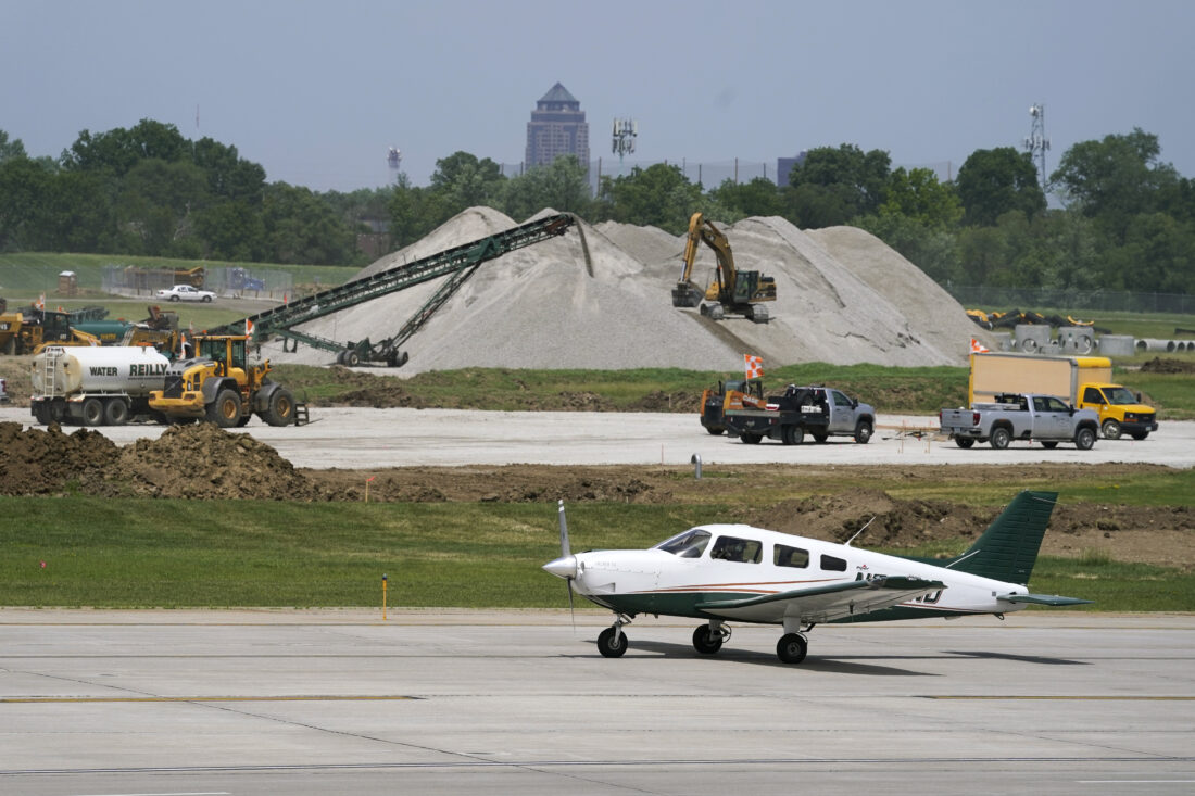 A small plane taxis past construction at the Des Moines International Airport, Monday, June 13, 2022, in Des Moines, Iowa. Officials at the airport were counting on the federal infrastructure money to replace an aging terminal with a modern structure. Four years ago, a new 14-gate terminal was projected to cost about $434 million and be open by 2026. By this spring, the cost had soared to $733 million. (AP Photo/Charlie Neibergall)