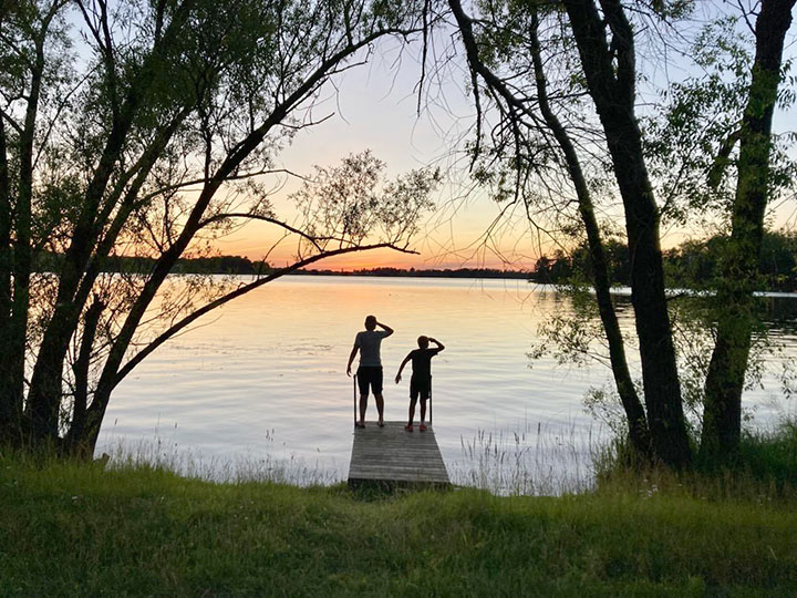 Aiden Valley, left, and Gavin Hendricks, both of Iron Mountain, try to spot loons on Lake Antoine as the sun sets Friday.
