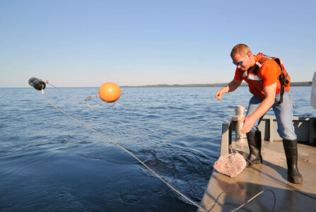 U.S. GEOLOGICAL SURVEY bioscience technician Henry Thompson deploys an underwater receiver mooring off the Michigan Department of Natural Resources research vessel Lake Char on the north side of Isle Royale in September 2018. (Andrew Muir, Great Lakes Fishery Commission)