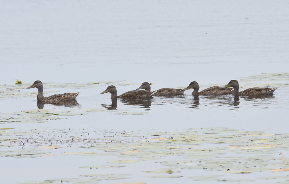 A MALLARD HEN leads her well-grown ducklings through the lily pads at Six Mile Lake in northern Dickinson County. Saturday’s warm, muggy conditions gave way to much-needed rainfall in the region. (Betsy Bloom/Daily News photo)