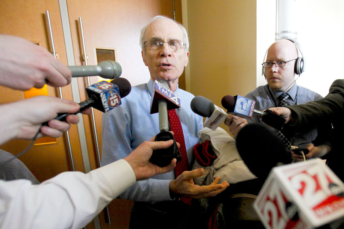 Wisconsin Secretary of State Doug La Follette speaks to reporters after a hearing on April 1, 2011, in Dane County Circuit Court in Madison, Wis. La Follette has said he decided to run again to stop Republicans from meddling with elections, citing Trump’s call to Georgia's secretary of state, Brad Raffensperger, after the 2020 election asking him to “find” enough votes to overturn Biden’s win in the state. (Michael P. King/Wisconsin State Journal via AP, pool, file)