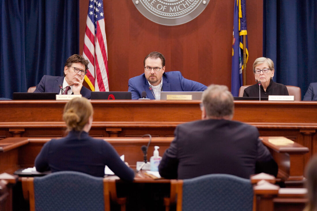 MEMBERS OF THE Michigan Board of State Canvassers — from left, Richard Houskamp, Anthony Daunt and Mary Ellen Gurewitz — listen to attorneys Olivia Flower and Steve Liedel during a hearing Wednesday in Lansing, Mich. (AP Photo/Carlos Osorio, file)