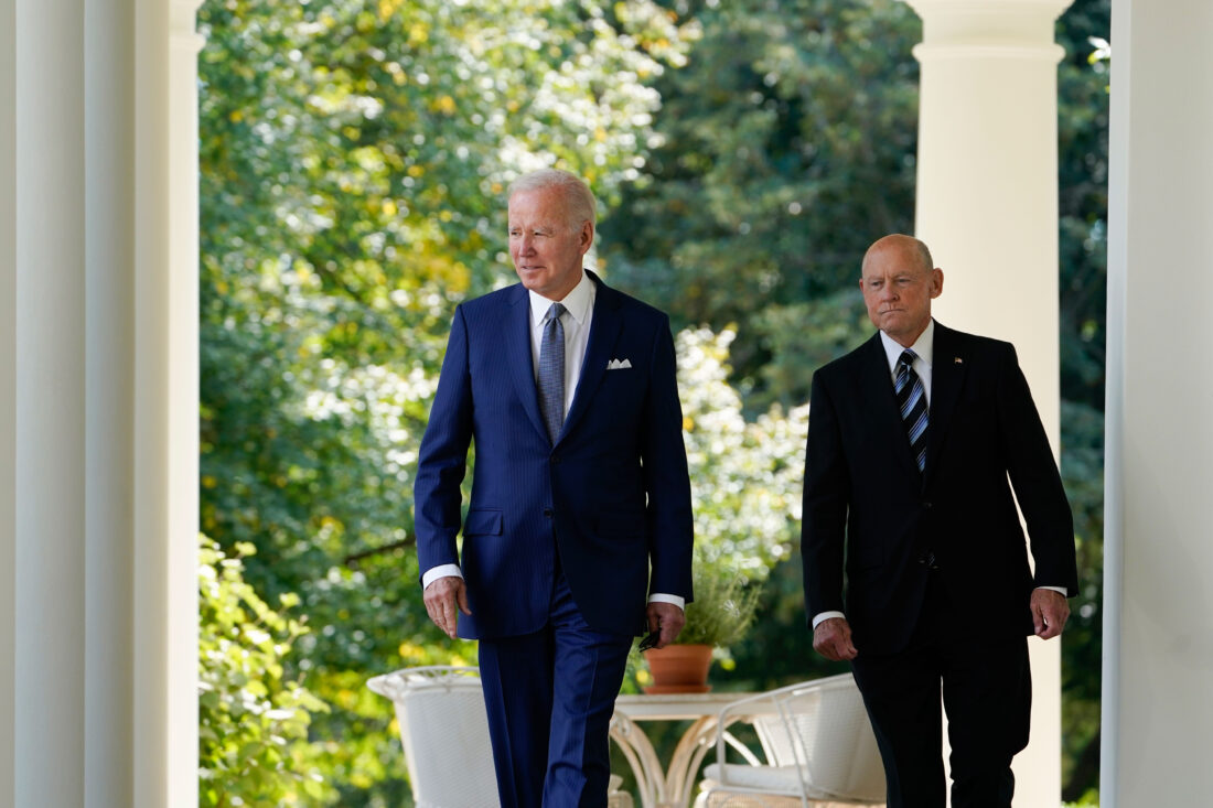 President Joe Biden walks with Bob Parant, Medicare beneficiary with Type 1 diabetes, as they arrive to speak at an event on health care costs, in the Rose Garden of the White House, Tuesday, Sept. 27, 2022, in Washington. (AP Photo/Susan Walsh)
