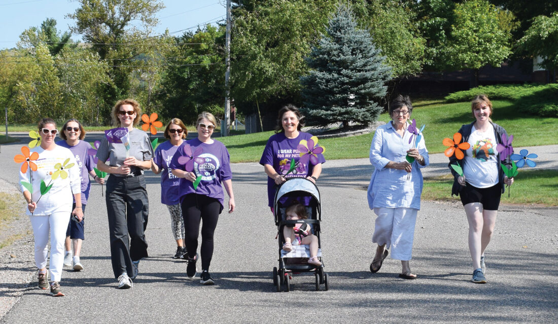 Community members joined together Tuesday to help raise awareness and funds to help find a cure for Alzheimer’s disease. The Cornish Pumping Engine Museum and World War II Glider and Military Museum was this year’s host for the annual Walk to End Alzheimer’s. Walkers received a Promise Garden Flower, which represents their connection to the devastating disease. Blue represents someone living with Alzheimer’s or another dementia, purple is for those who lost someone to the disease, yellow is someone currently supporting or caring for a person living with the disease and orange is for those who supports the cause and the Alzheimer’s Association’s vision. From left, participants included Beth Wilmers, Sue Tinti, Michele Boehmer, Janet Terwilliger, Mary Tuomela, Julia Berglund with granddaughter Charlotte Redding, Judy Sanicki and Abbigail Berglund. (Terri Castelaz/Daily News photo)