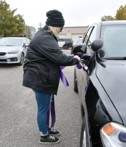 - A “Break the Silence” event took place Tuesday in Iron Mountain, with squad cars, fire engines, ambulances and citizens driving from the Dickinson County Sheriff’s Office to First Presbyterian Church in Kingsford with sirens blaring and horns sounding. The annual event during Domestic Violence Awareness Month aims to shine a light on domestic violence and encourage people to speak up if they face such treatment or know of someone who is being abused. Here, Amanda Johnson, a Caring House volunteer and domestic violence survivor, ties a purple ribbon — representing domestic violence awareness — on a Michigan State Police vehicle. (Marguerite Lanthier/Daily News photo)